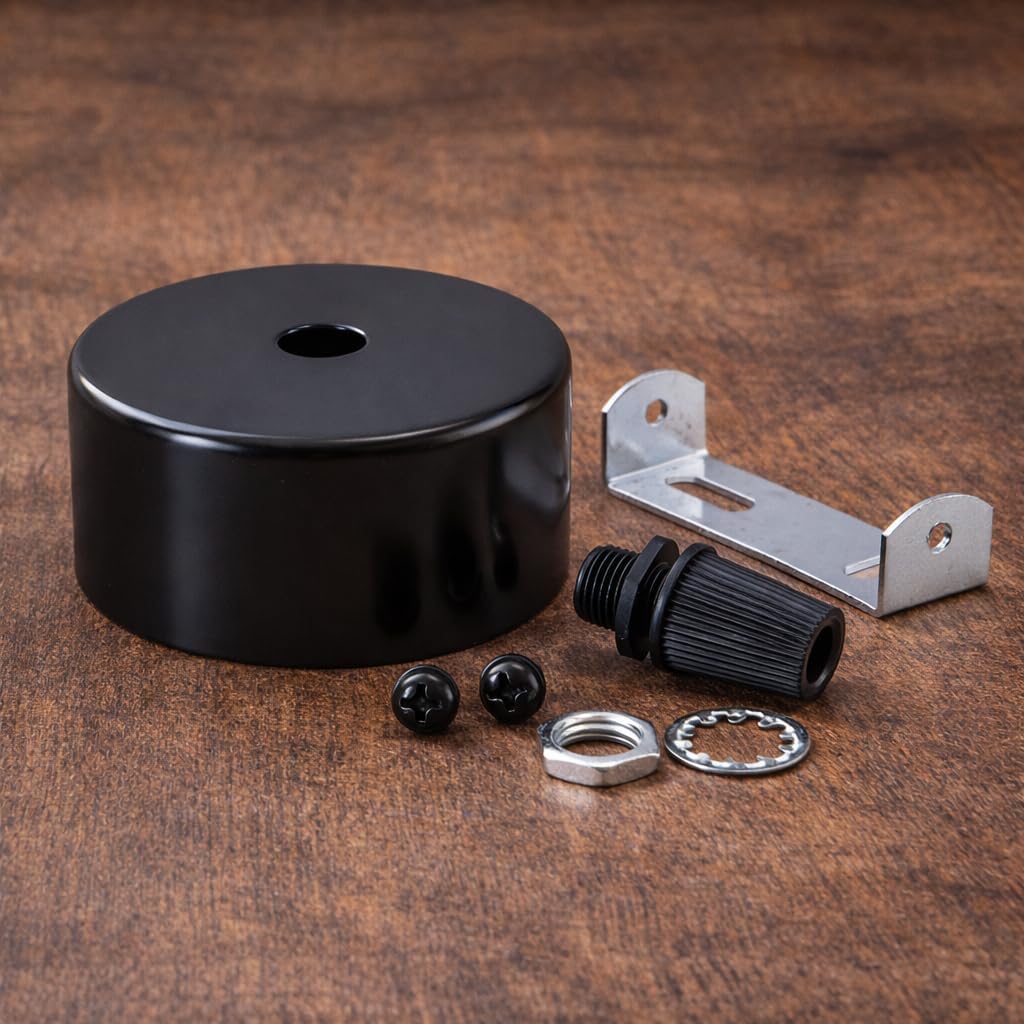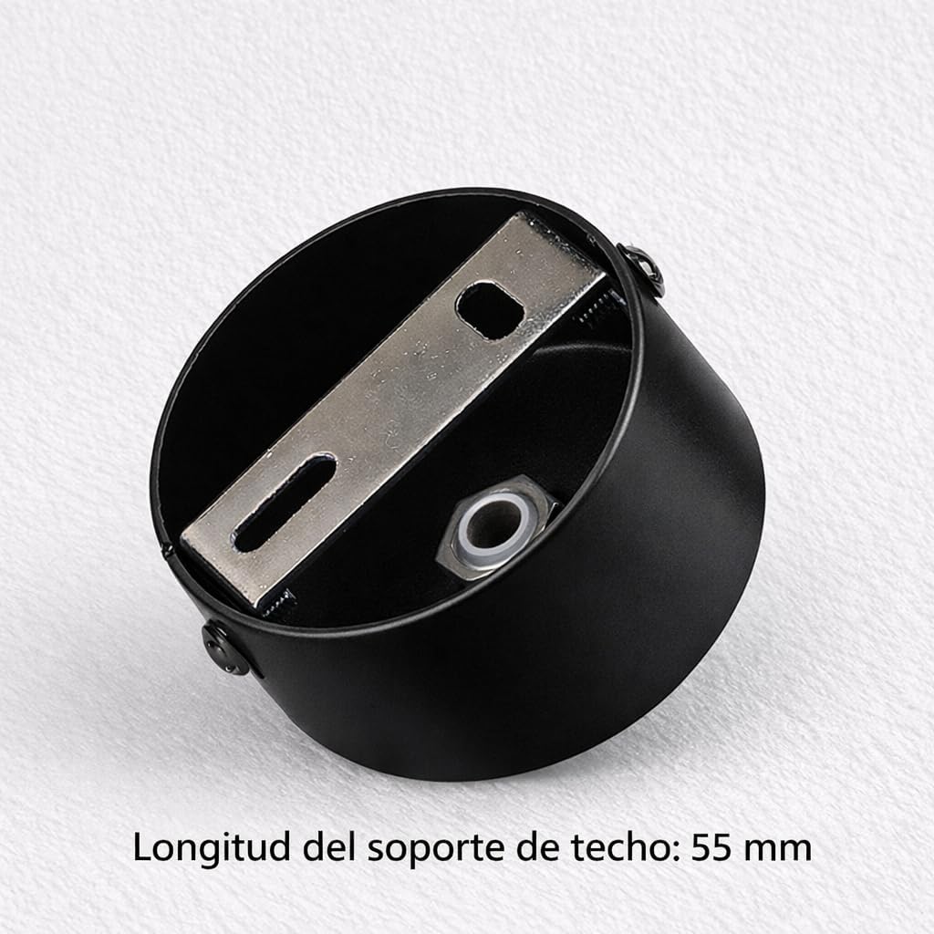 This ceiling light rosette, also known as trim or metallic flood, is designed to cover the cable outlet and enhance the visual finish in indoor lighting installations. Made from steel with matte black finish, it offers a discreet and functional solution especially suitable for compact pendant lamps or minimalist light spots. Thanks to its size of 60 x 30 mm, it allows for clean visual integration without taking up unnecessary ceiling space. The product is supplied in a pack of 2 pieces and includes mounting accessories necessary for indoor installation. Technical data: Type: Rosette / ceiling trim Material: Steel Finish: Matte Black Diameter: 60 mm Height: 30 mm Metal Thickness: Approx. 1 mm Usage: Indoor Compatibility: Pendant Lights Contents: 2 x Rosettes + Installation Kit