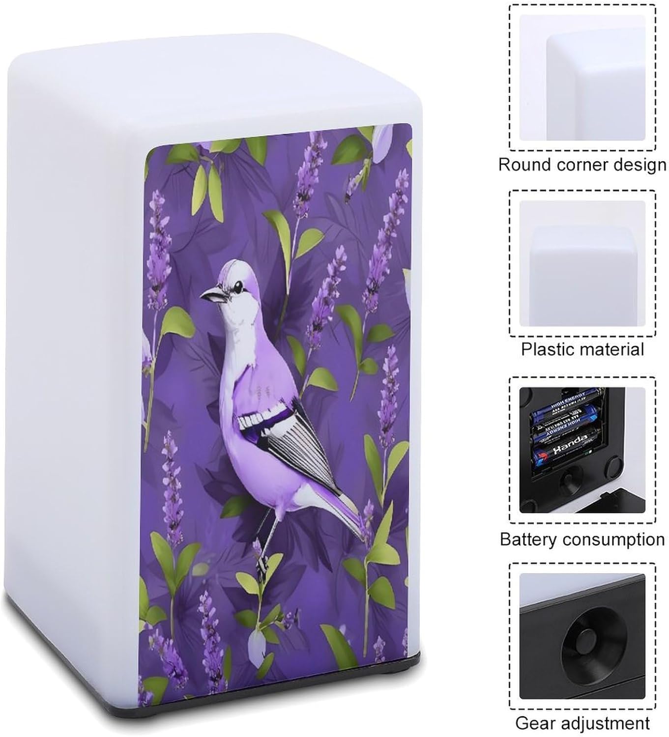 Tired of groping in the dark at night? Looking for a desk lamp that's both practical and stylish? Our Bird in Purple Lavender Floral Flowers printed small desk lamp is the solution you've been looking for—designed to make everyday life easier and more personalizedSay goodbye to the same old, cookie-cutter desk lamps. We use UV printing technology to imprint your lamp with a design. Even years later, these designs remain visible, transforming an ordinary desk lamp into a treasured keepsakeThe soft, warm glow is a game-changer. For night owls, it means no more waking up your partner. For those afraid of the dark, it's a nighttime companion that dispels the darkness and helps them fall into a deep sleep. Even at the bar, it creates a warm and cozy atmosphere without being overly dazzlingIt's compact and portable, making it easy to place anywhere—by your bed, on a bathroom counter, or to take with friends. Its thick plastic material withstands accidental knocks and can be kept clean with a quick wipeStruggling to find a gift that's both practical and thoughtful? This lamp for dorm ticks all the boxes. It'll be a unique gift that shows you care. Your friends and parents will think of you every time they open it