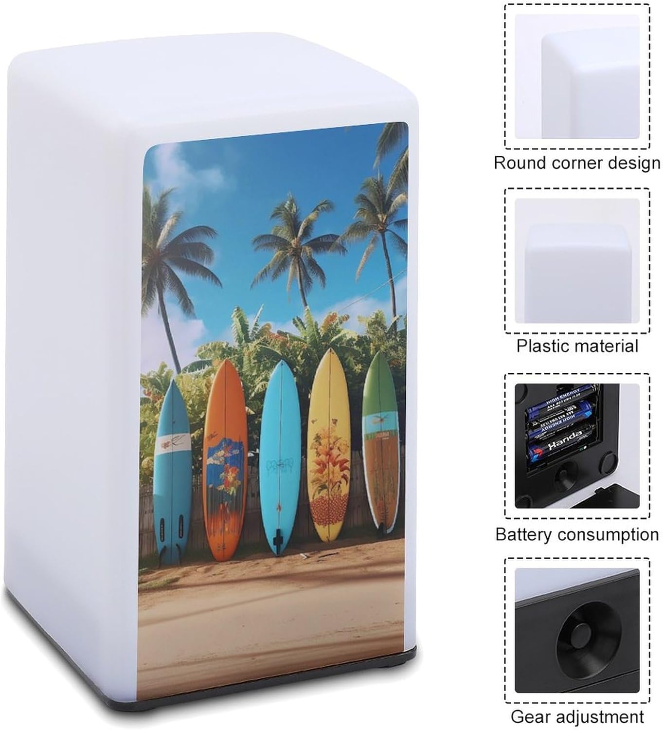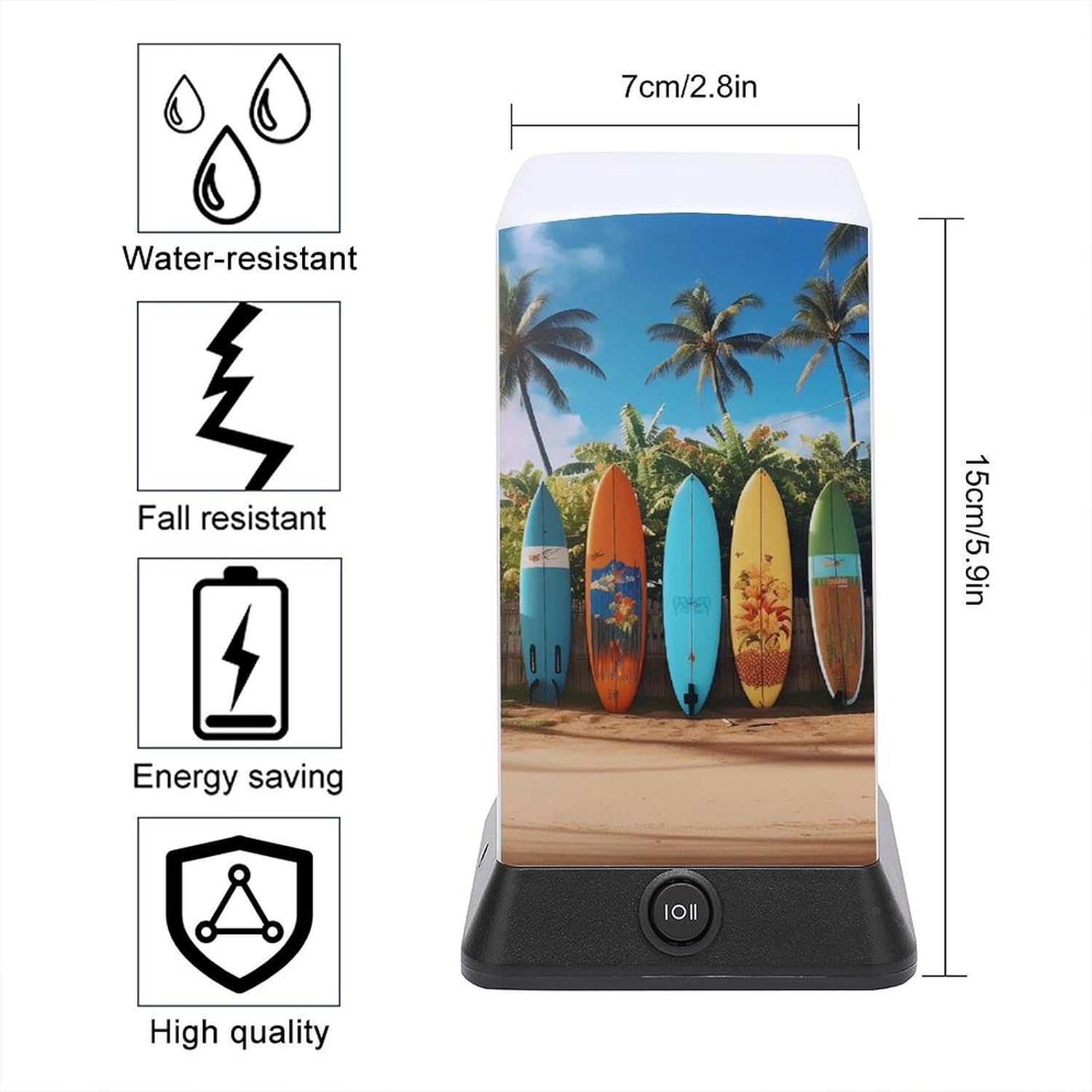 With a strong, impact-resistant plastic construction, this Surf's Up Surfboard printed small bedside table is durable enough to withstand accidental knocks and splashes, making it an ideal lighting companion for bathrooms, kitchens and more. The carefully designed rounded edges ensure safety and fit in any homeThis cordless lamp is ultra-portable, meaning it won't take up much space on your desk or bedside table. And it's battery-powered so you can get light wherever you need it - in the bathroom, hallway, or even outdoors (note: not rechargeable)It easily adjusts the brightness to suit any activity, so it's versatile! In the bedroom, it's a bedside lamp, where the soft light helps you fall asleep easily without the harsh light. In bars and lounges, it creates a warm and inviting atmosphereThis mini lamp combines classic style with modern functionality, making it an ideal gift for friends, family or colleagues. This thoughtful gift is sure to surprise them with a sense of style, practicality and convenience
