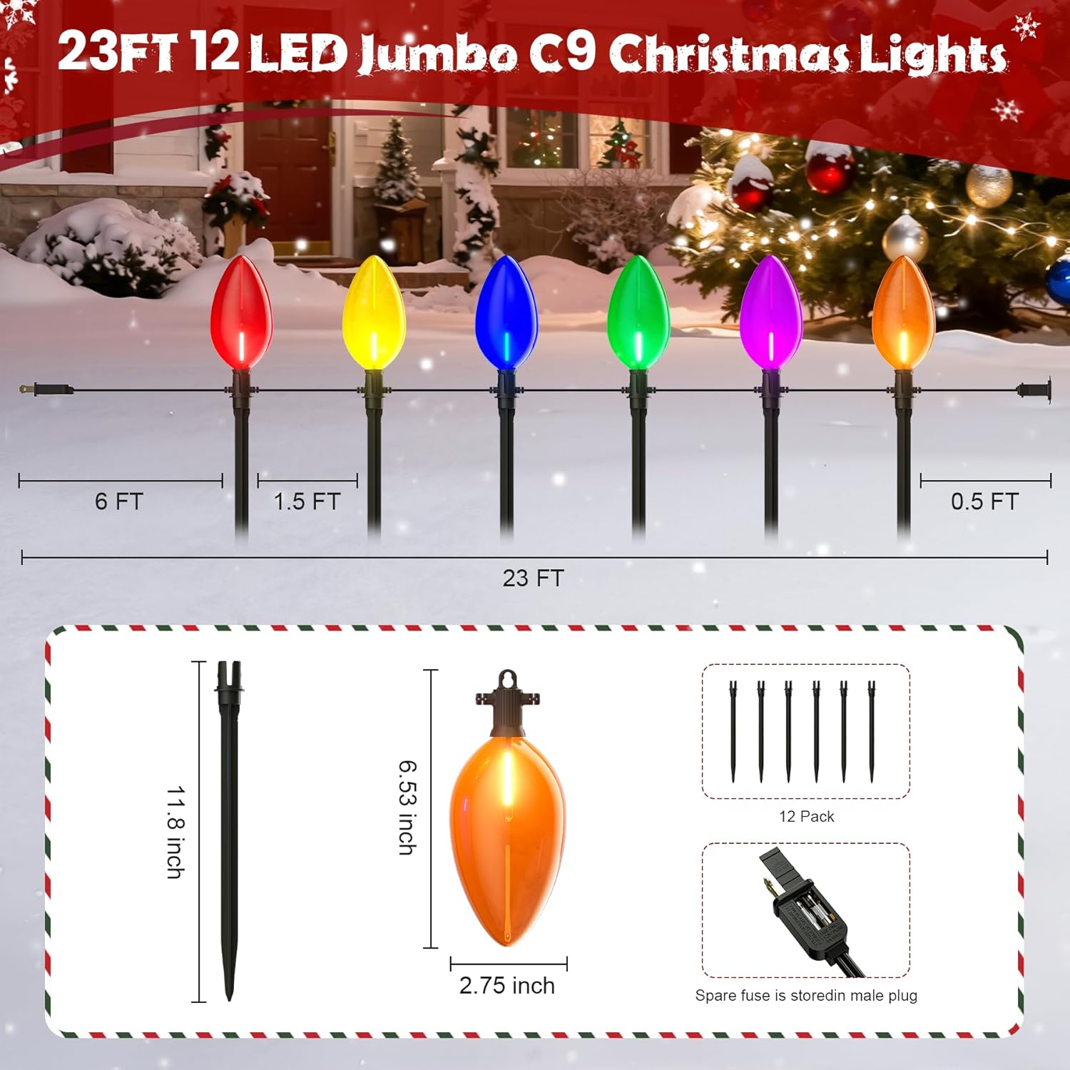 | Included Components | 1 x 12 Ground Stakes, 1 x Jumbo C9 Christmas Pathway Lights (12 bulbs), 1 x User Manual |