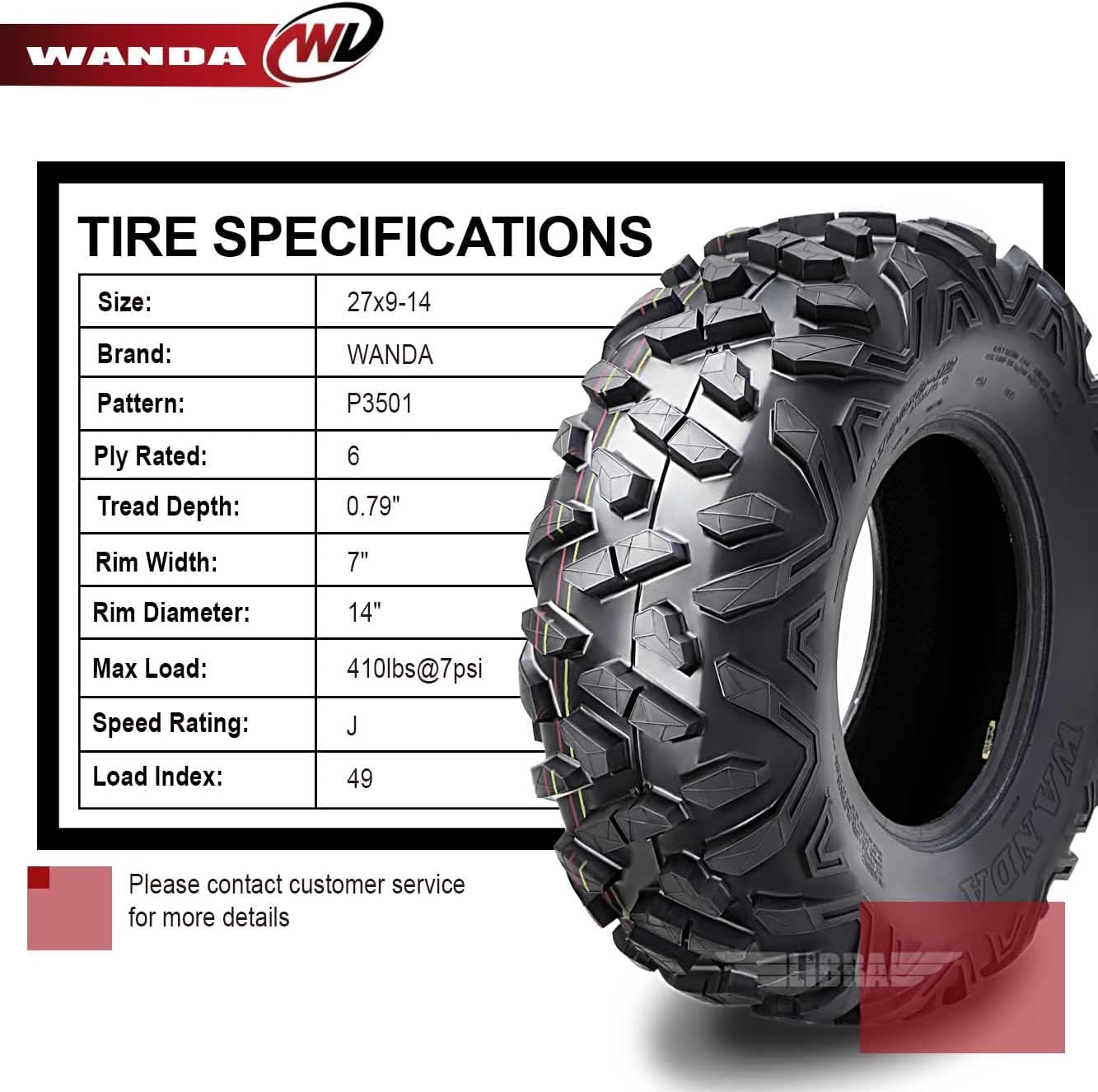 2 front tires compatible for 2014 John Deere GATOR XUV825I 4x4SE. Top notch handling in dirt, mud or rock, Superior traction in woods, Great in the desert. Additional shoulder lugs protect rim and sidewall. Heavy 6 ply rated construction resists punctures and abrasions. 36% deeper tread than major competitor with similar tread patterns, result as heavier, longer lifetime, and more aggressive. Tires only, wheels not includedTire SpecificationsTire Size: 27x9-14Brand: WANDATread Pattern: P3501Ply Rated: 6Tread Depth: 0.79Rim Width: 7Max Load: 410lbs@7psiLoad Index: 49Speed Rating: JPlease note: fitment guide is for reference only and does not guarantee the tire will fit your specific model. Please check your owner's manual to ensure proper fitment.