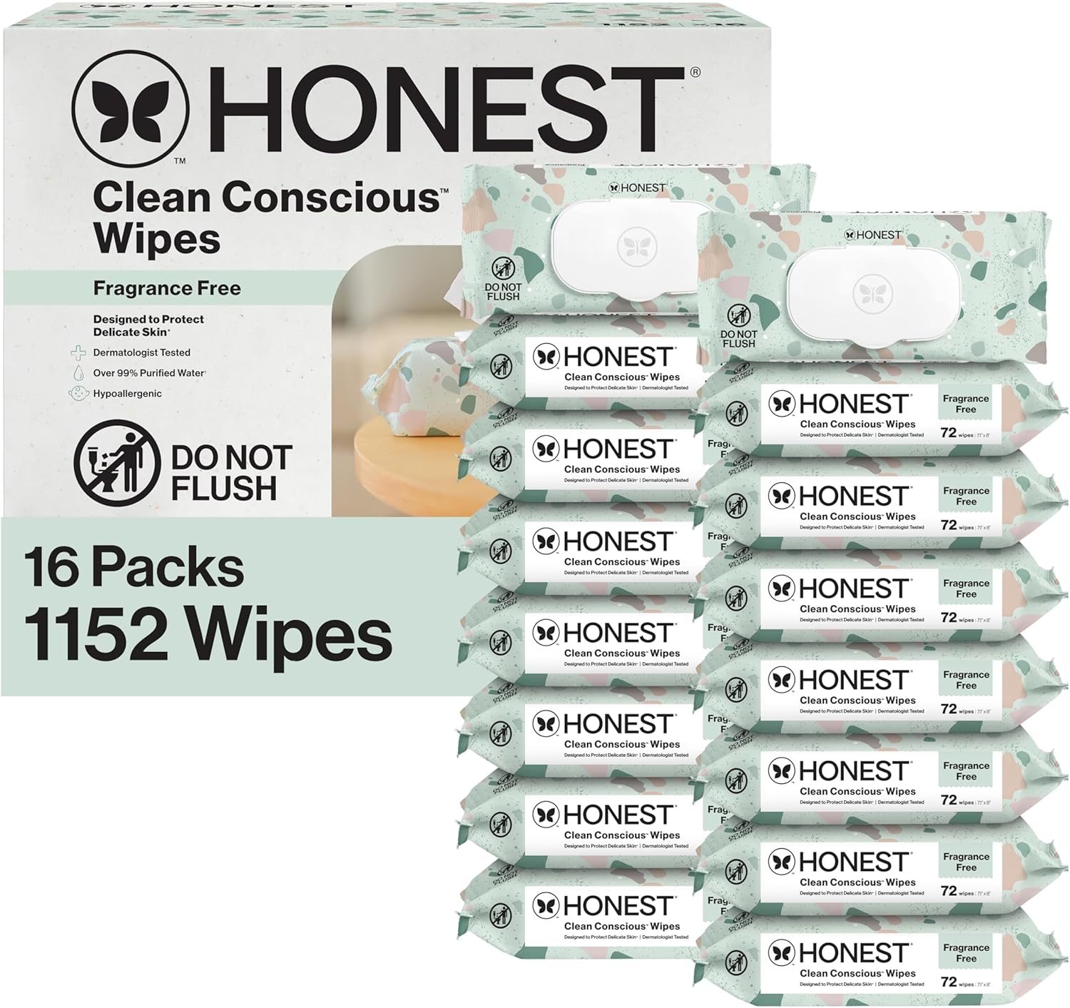 Clean up all of life’s messes with our compostable plant-based baby wipes, made with over 99% water and gentle on sensitive skin. From diaper change duty and messy fingers to sticky counters and gunked-up toys — our ultra-durable, extra thick wipes get the job done! These hypoallergenic plant-based wipes are dermatologist-tested and are made with only 7 transparent ingredients that are toxicologist-audited, making them safe + gentle for baby and the whole family. Wipes made without plastic, fragrances, parabens, and chlorine processing – containing everything you need and nothing you don’t. Now Compostable! Honest Baby Wipes disintegrate in 8 weeks.** For municipal: Always check for the availability and acceptance of municipal/institutional composting facilities as they may be limited in your area. For home: Do not compost if wipes are used to clean non-compostable items like human/animal waste or mixed with cleaning soaps/sprays. Generally, wipes shouldn't be more than 10% of your compost heap. **Following Modified ISO 20200 standards to assess disintegration under home composting conditions.