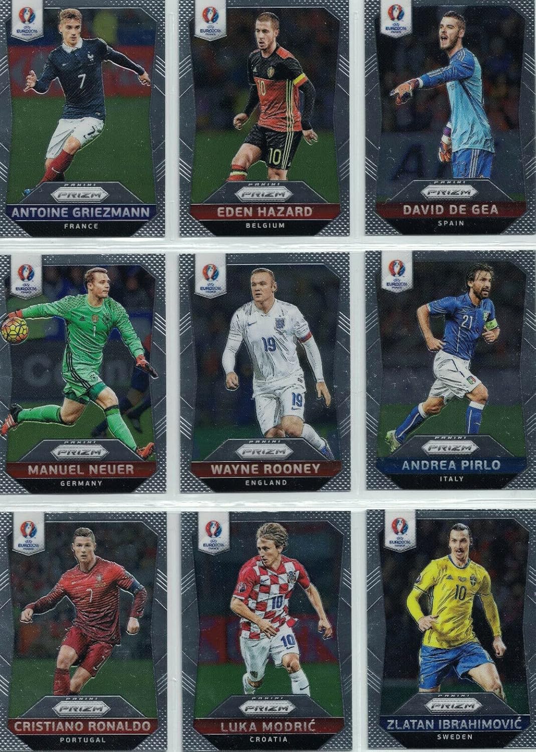 This is the 2016 Panini PRIZM UEFA Soccer series complete mint 250 card set; it was never issued in factory set form. Loaded with your favorite international stars including Cristiano Ronaldo, Luka Modric, Mario Gotze, Wayne Rooney, Robbie Keane, Oscar, Gianluigi Buffon, Bastian Schweinsteiger, Pepe, Zlatan Ibrahimovic, Kevin De Bruyne and Gareth Bale and many others. National teams represented include Germany, Spain, Brazil, Argentina, Portugal, USA, Mexico, England, Italy, France, Holland and others and players are shown in their national team uniforms. All of the cards have a metallic silver finish, high quality product. TOUGH set to find!